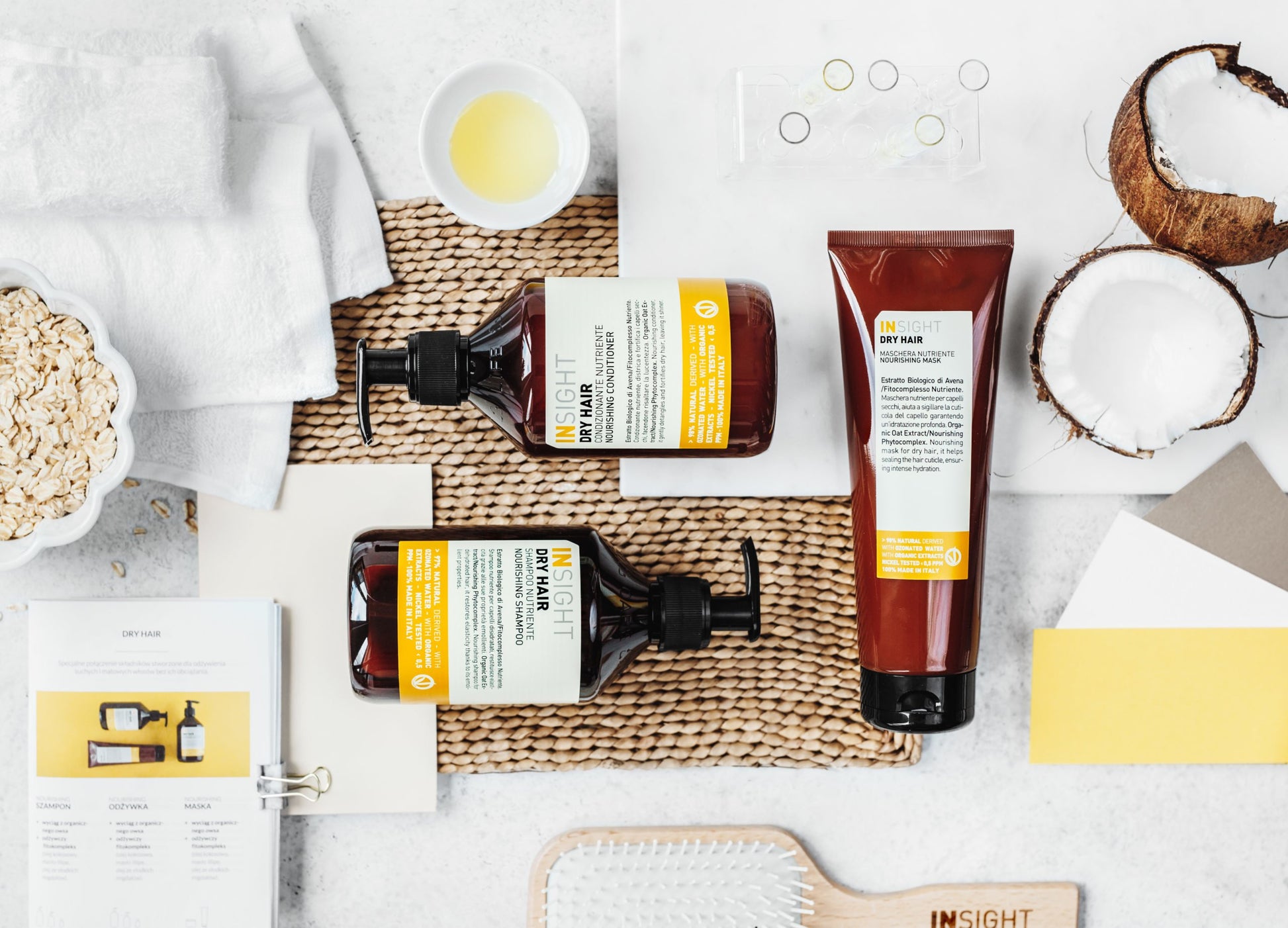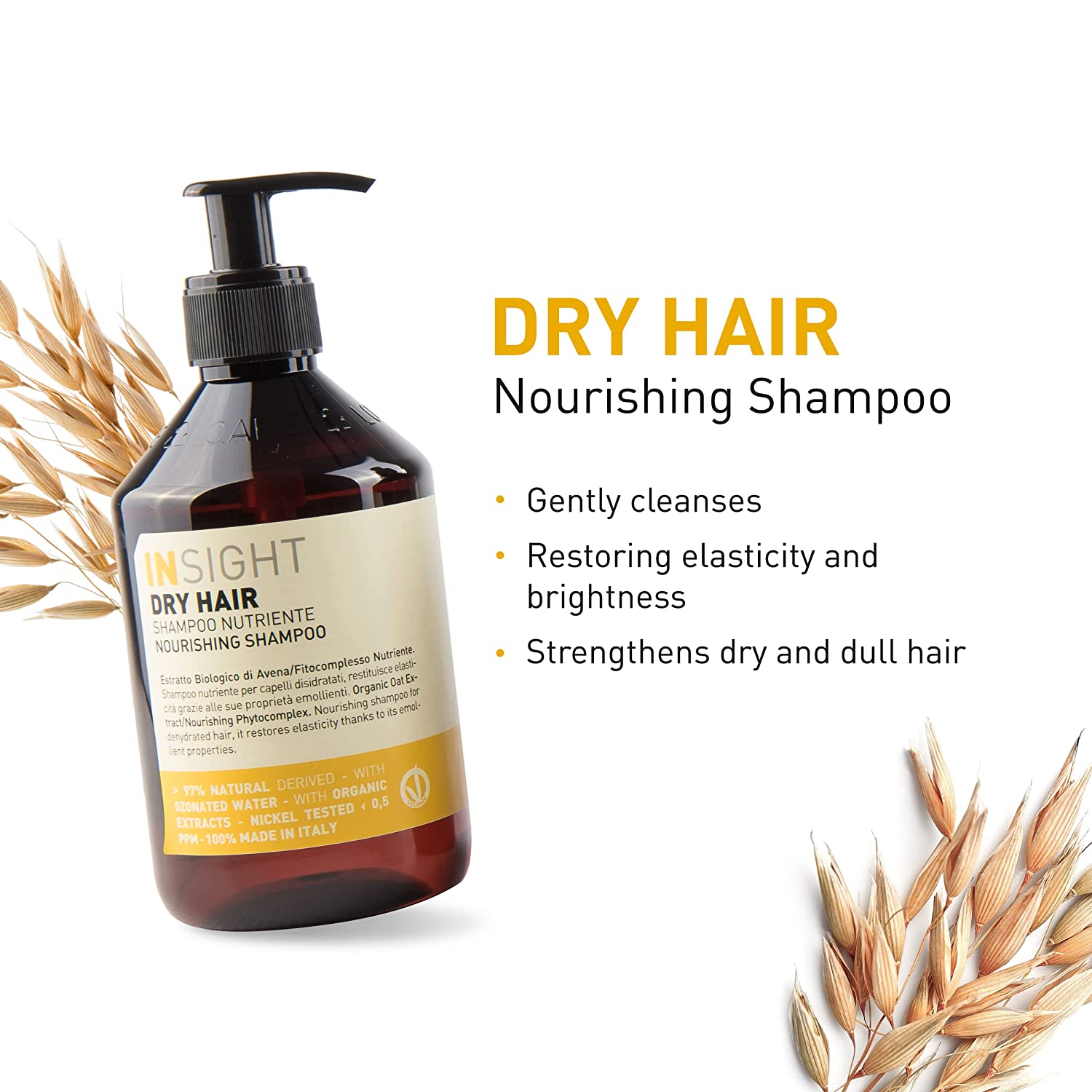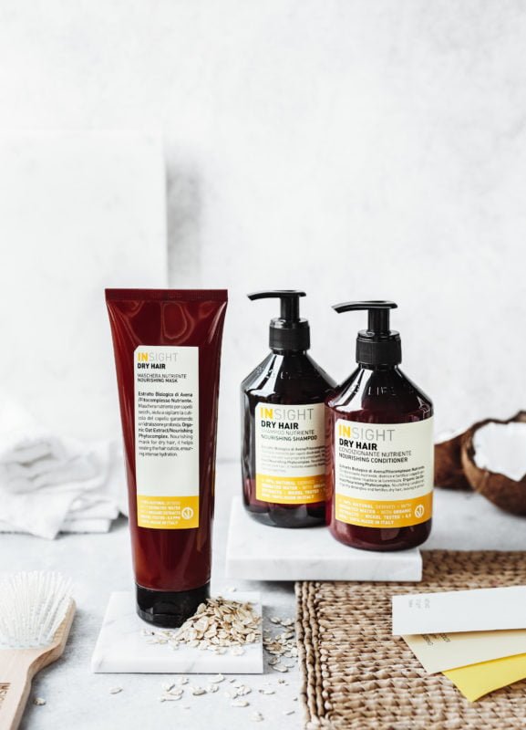 Insight Nourishing Shampoo is made with a nourishing and soothing phytocomplex composed of organic oats extract, illipé butter, and organic coconut oil.