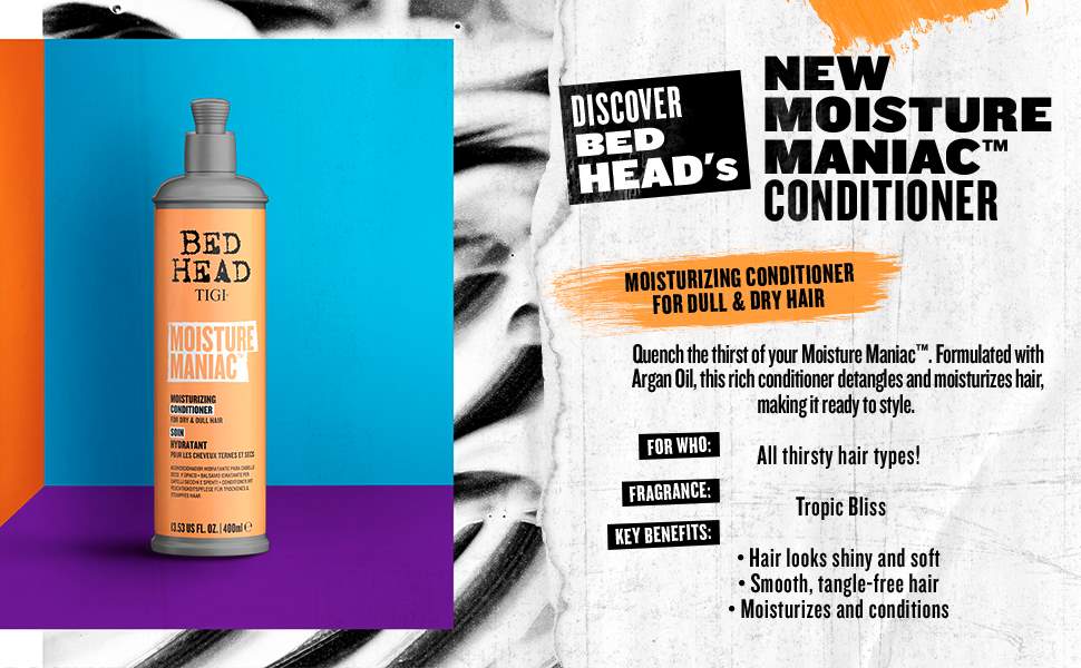 Give dry hair a hit of moisture with the Bed Head Moisture Maniac Conditioner! This rich conditioner deeply moisturises and conditions so hair is left hydrated, soft and shiny. The conditioner also helps detangle hair for a smooth end look.