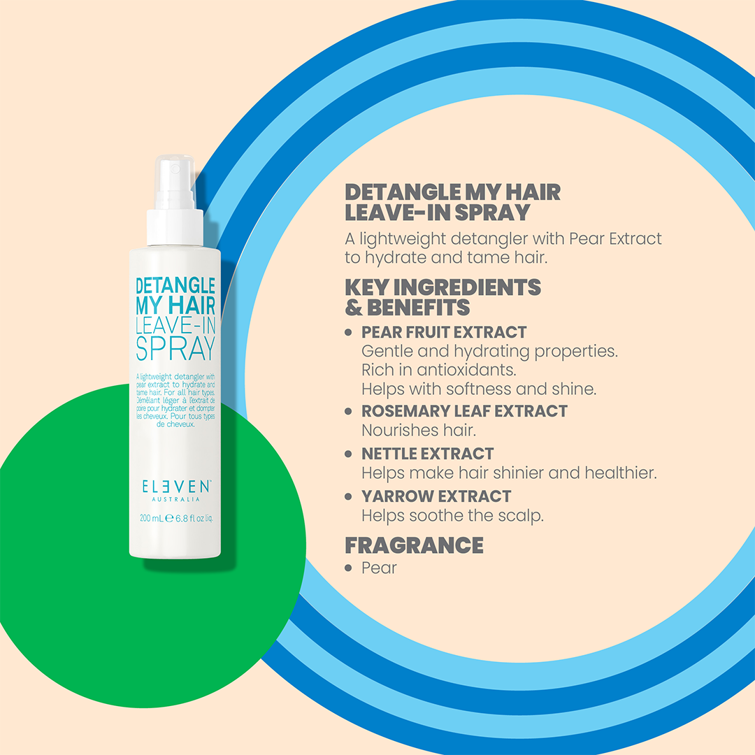 | Pear Fruit Extract (in leave-in spray) | Conditions hair, helps detangle and smooth for sleek results. |