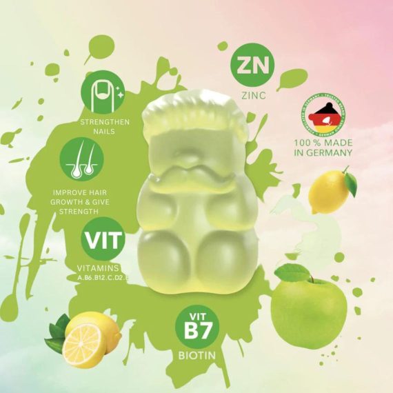 ๐—œ๐—ฉ๐—ฌ๐—•๐—˜๐—”๐—ฅ๐—ฆ ยฎ contain biotin, folic acid and zinc. In addition, the bears contain the key vitamins A, C, D, E, B5, B6 and B12 All the gummy bearsโ€™ nutrients are needed for the maintenance and growth of healthy hair. Thus, the hair is optimally supplied with the right minerals and vitamins every day and is in top shape!