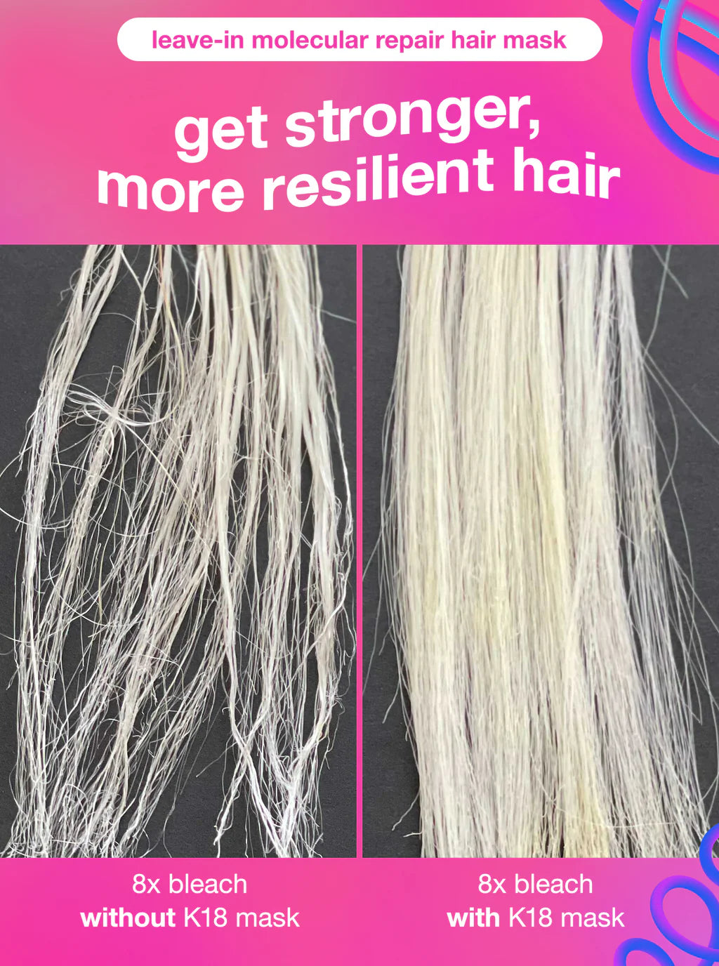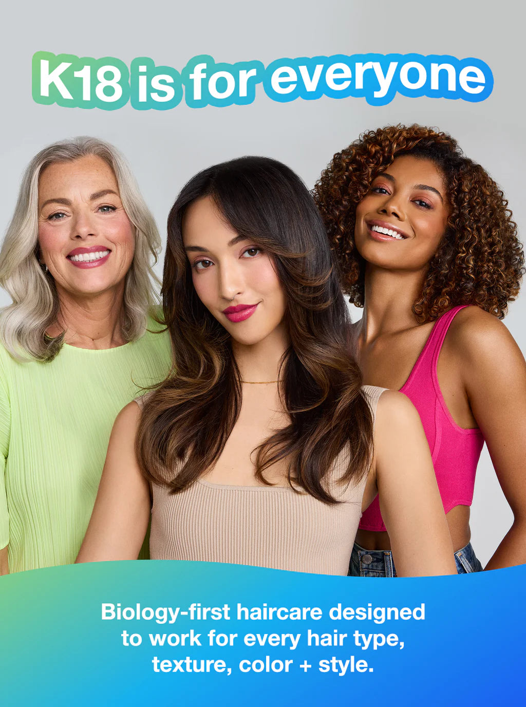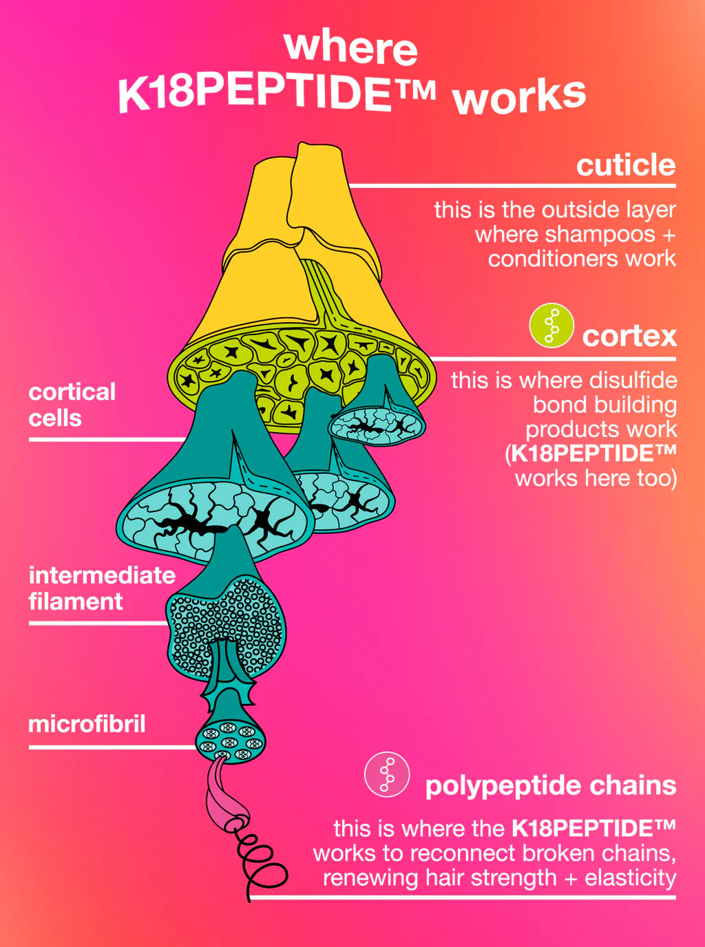 leave-in molecular repair hair mask: reverses hair damage in 4 minutes* - K18PEPTIDE™ is a biotech-developed peptide that mimics hair's structure to reverse damage by reconnecting polypeptide chains and disulfide bonds broken during bleach, color, chemical services + heat