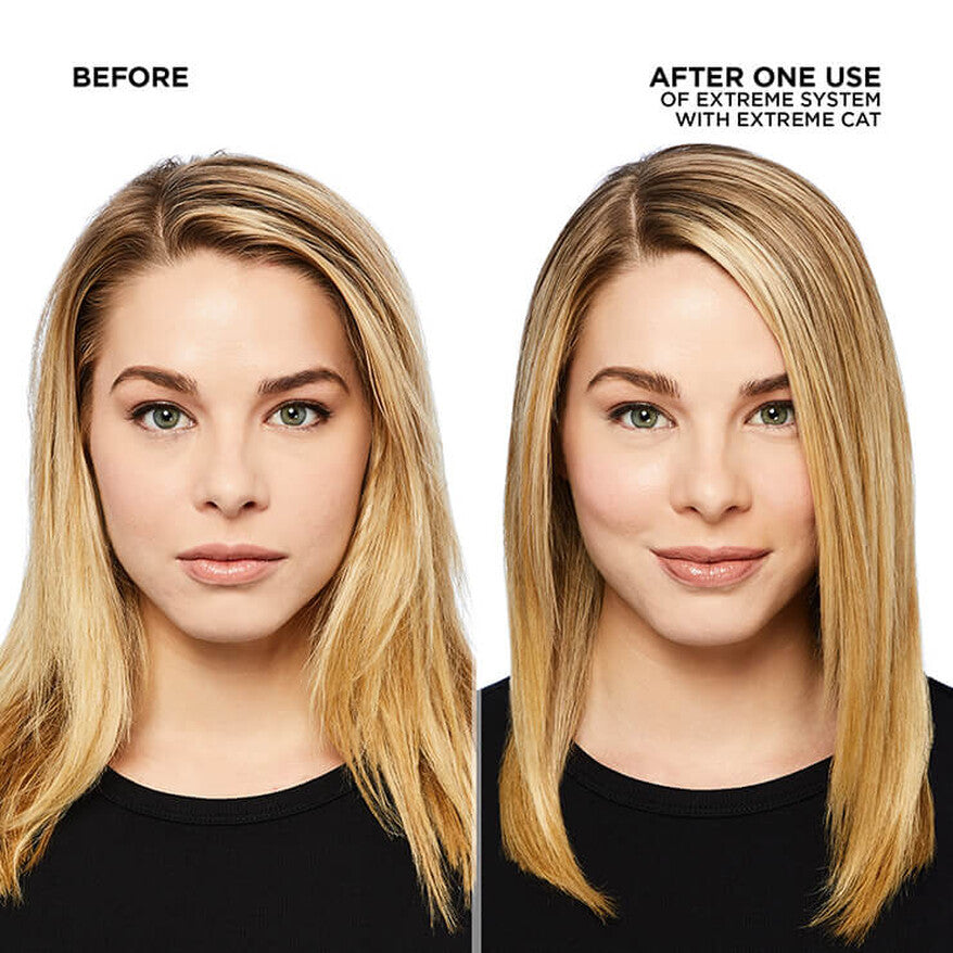 Redken's powerful prescription to reconstruct damaged proteins to reinforce distressed hair, Redken Extreme CAT treatment is a rinse-out to strengthen strands against hair breakage. Extreme CAT treatment is also used by Pros to prep and strengthen hair prior to chemical services that can disrupt the hair's protein.