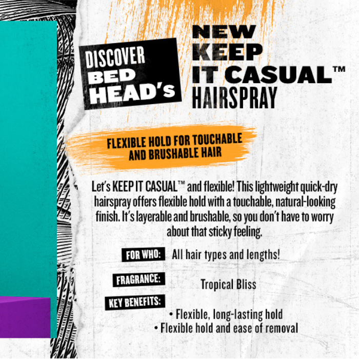 Bed Head’s new Keep It Casualᵀᴹ Hairspray; a brushable, flexible formulation, not only designed with, but used by salon professionals. Delivering salon results and salon experience at home.