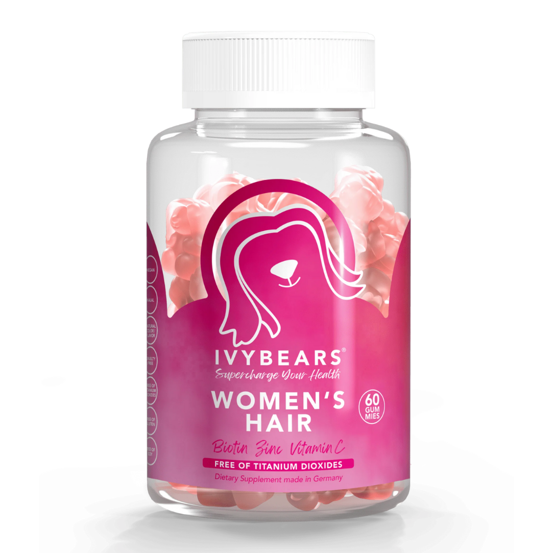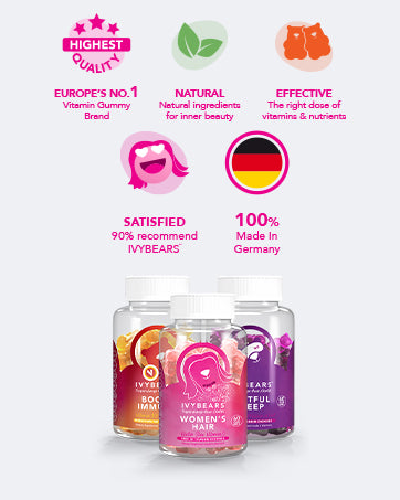 IVYBEARS Women’s Hair contain biotin, folic acid and zinc. In addition, the bears contain the key vitamins A, C, D, E, B5, B6 and B12. All the bears nutrients are needed for the maintenance and growth of healthy hair. So your hair is optimally supplied with the right minerals and vitamins every day and is in top shape!
