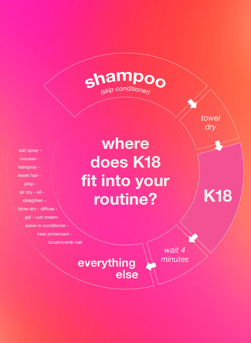 A colour-safe clarifying shampoo that deeply cleans without stripping. Removes buildup, metals, and product residue to create a clean canvas for the K18Peptide™ to work its magic.