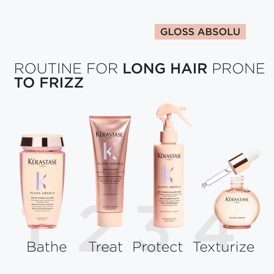Gloss Absolu Anti-Frizz Ritual, consisting of Hydra-Glaze Bain, Insta Glaze Fondant, anti-frizz glaze milk and Glaze Drops Oil, for long hair prone to frizz seeking smoothness and shine.